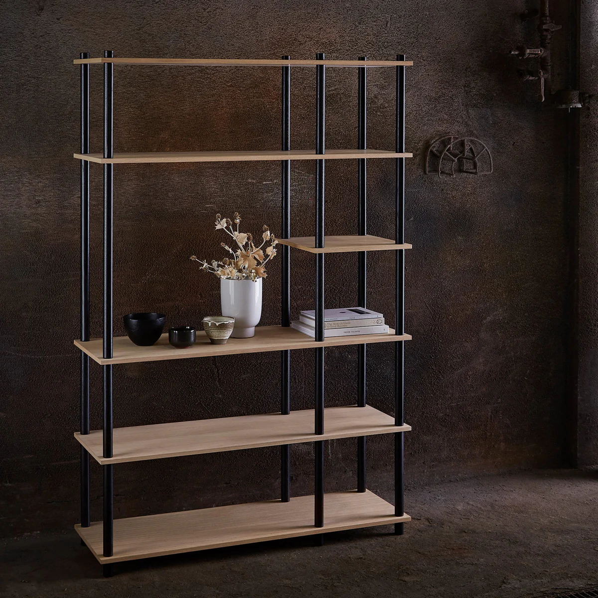 Með mismunandi hillum og töppum er hægt að stækka og setja Elevate saman á óendanlegan fjölda útfærslna án þess að nota verkfæri. Raðaðu einfaldlega hillunum upp eins og þú vilt hafa þær, hertu tappana og lyftu þeim síðan upp. Hinir mismunandi hlutar eru pakkaðir í kassa hver fyrir sig svo þú getir sérsniðið nákvæmlega þá hillu sem þú vilt – að þínum þörfum. Notaðu Elevate sem geymslu, fyrir kassa, skrifstofuvörur, listaverk eða plöntur. Og það allra besta er að ef þú færð leið á samsetningunni getur þú einfaldlega breytt henni með örfáum handtökum.