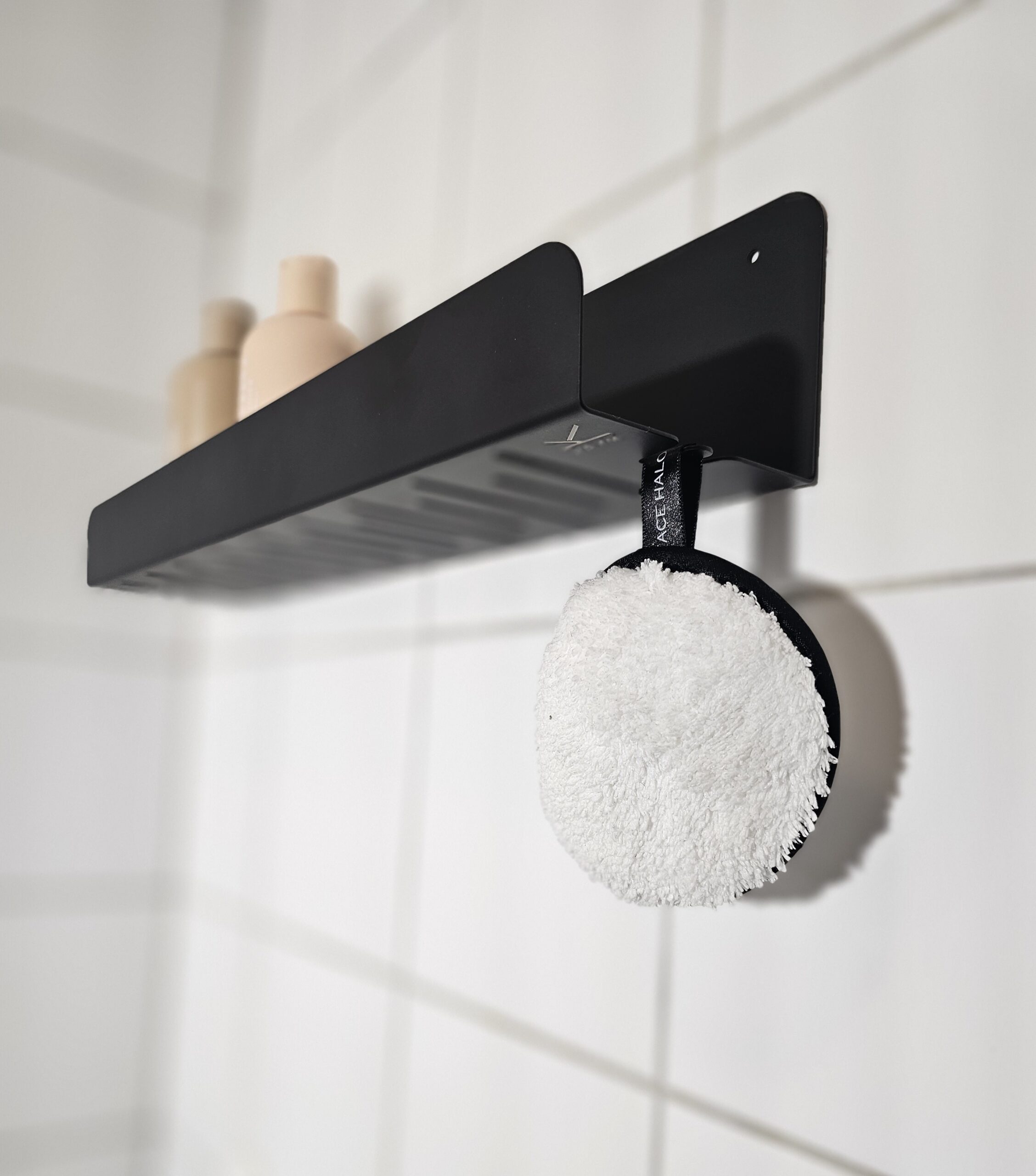 Hillan er framleidd úr 302 ryðfríu stáli og húðuð með slitsterkri dufthúðun sem veitir yfirborðinu aukna vörn gegn raka og daglegu sliti. Útkoman er varanleg og falleg lausn sem heldur sér vel í krefjandi umhverfi eins og í sturtu. Í botni hillunnar eru rifur sem hleypa vatni í gegn, sem hjálpar til við að halda yfirborðinu hreinu og þurru. Á sitthvorum endanum eru hankar sem henta vel til að hengja þvottapoka, skrúbb eða aðra fylgihluti.