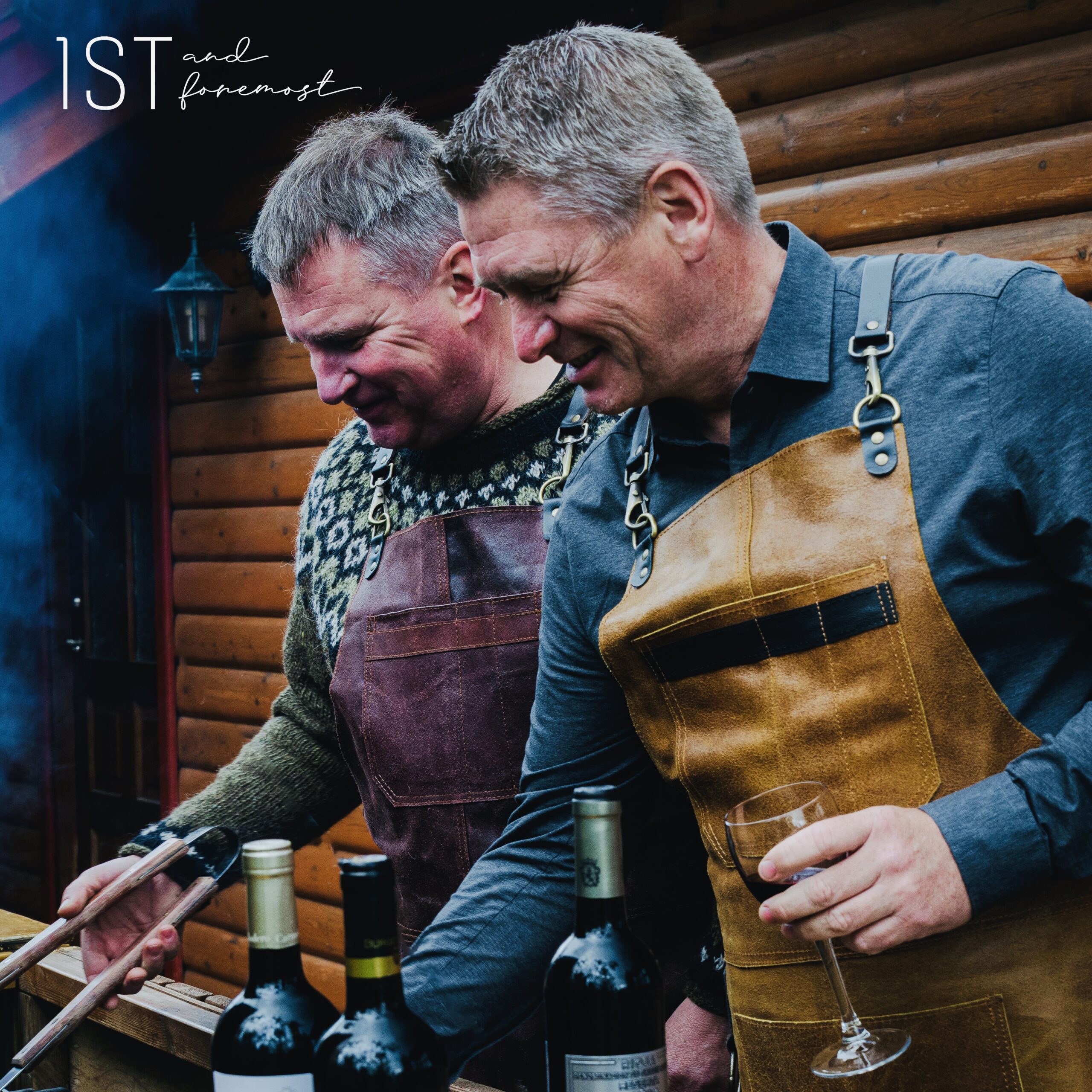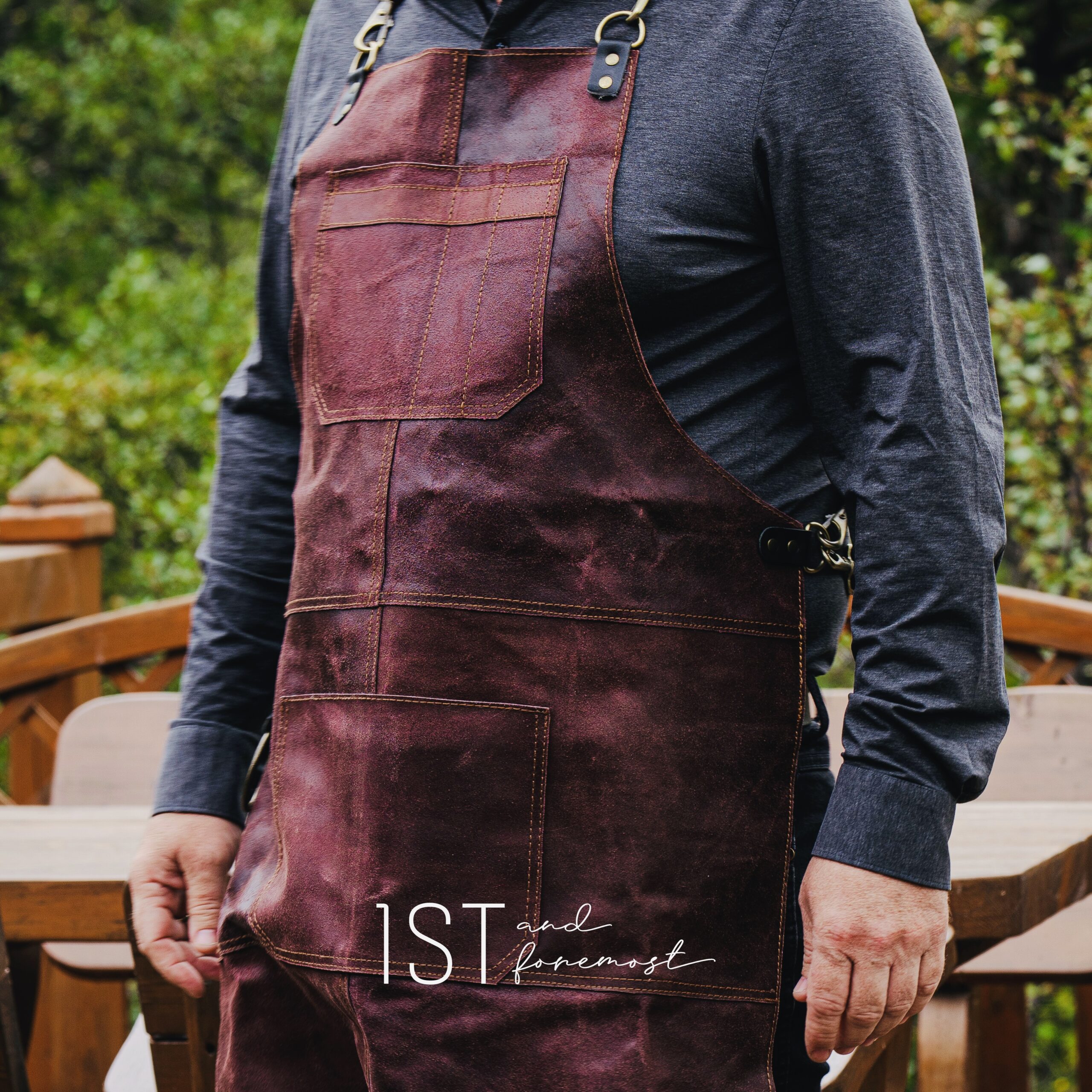 Leðursvuntan er handunnin og kemur með „cross-body“ ólum sem gera hana bæði flottari og þægilegri. Á svuntunni eru margskonar vasar og stálhringur fyrir viskastykkið. Hana má allt eins nota við vinnu í bílskúrnum, eldhúsinu og við grillið.