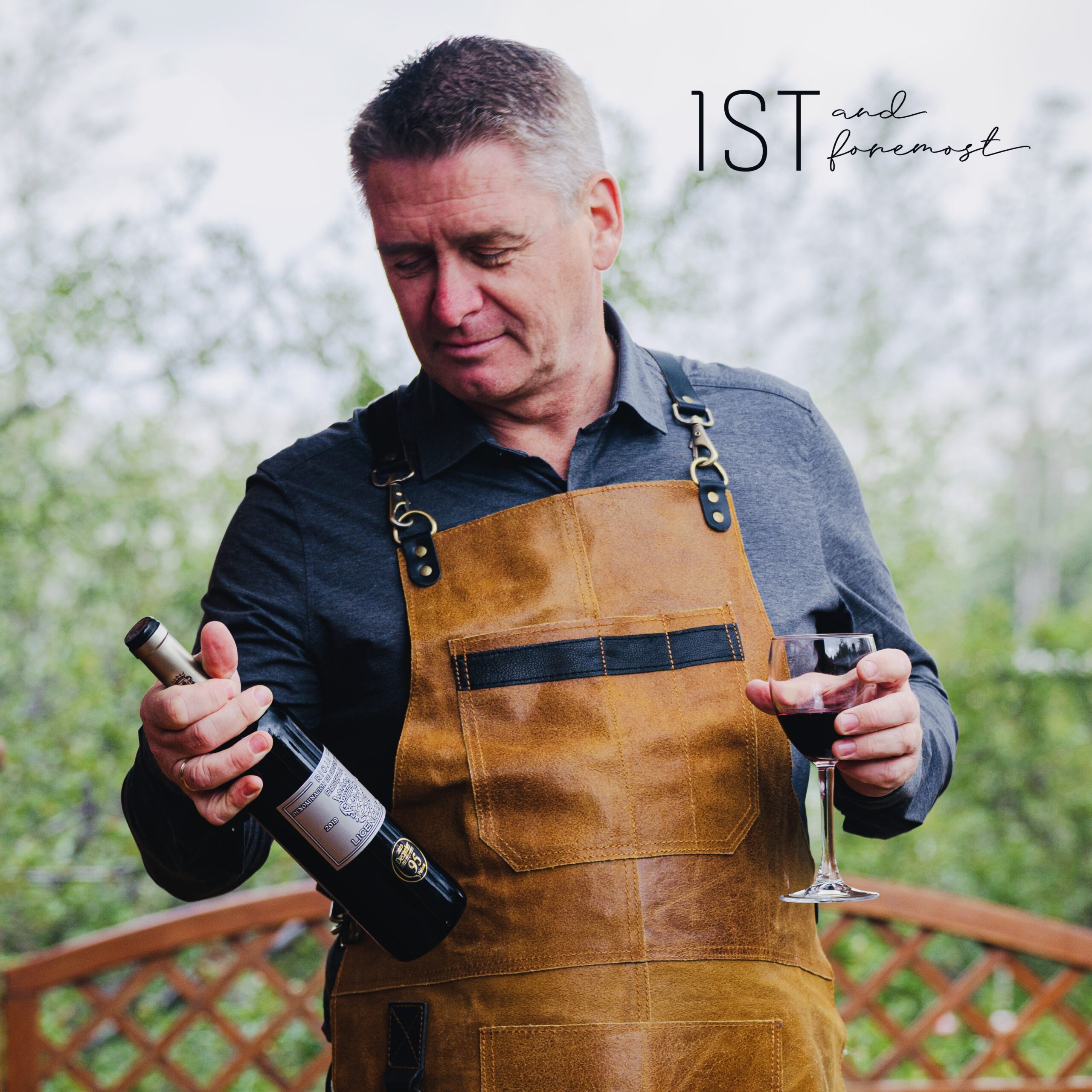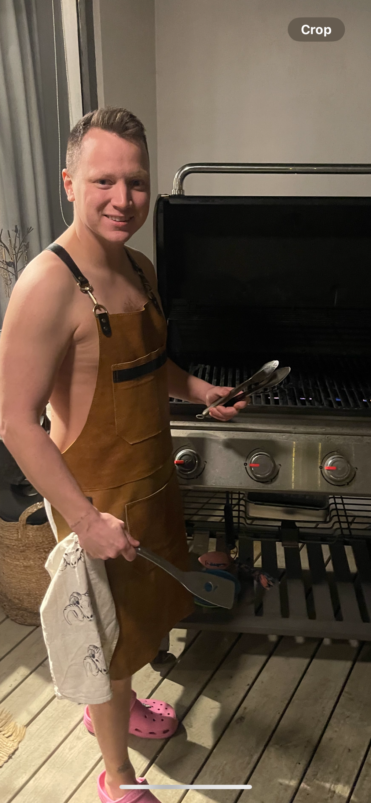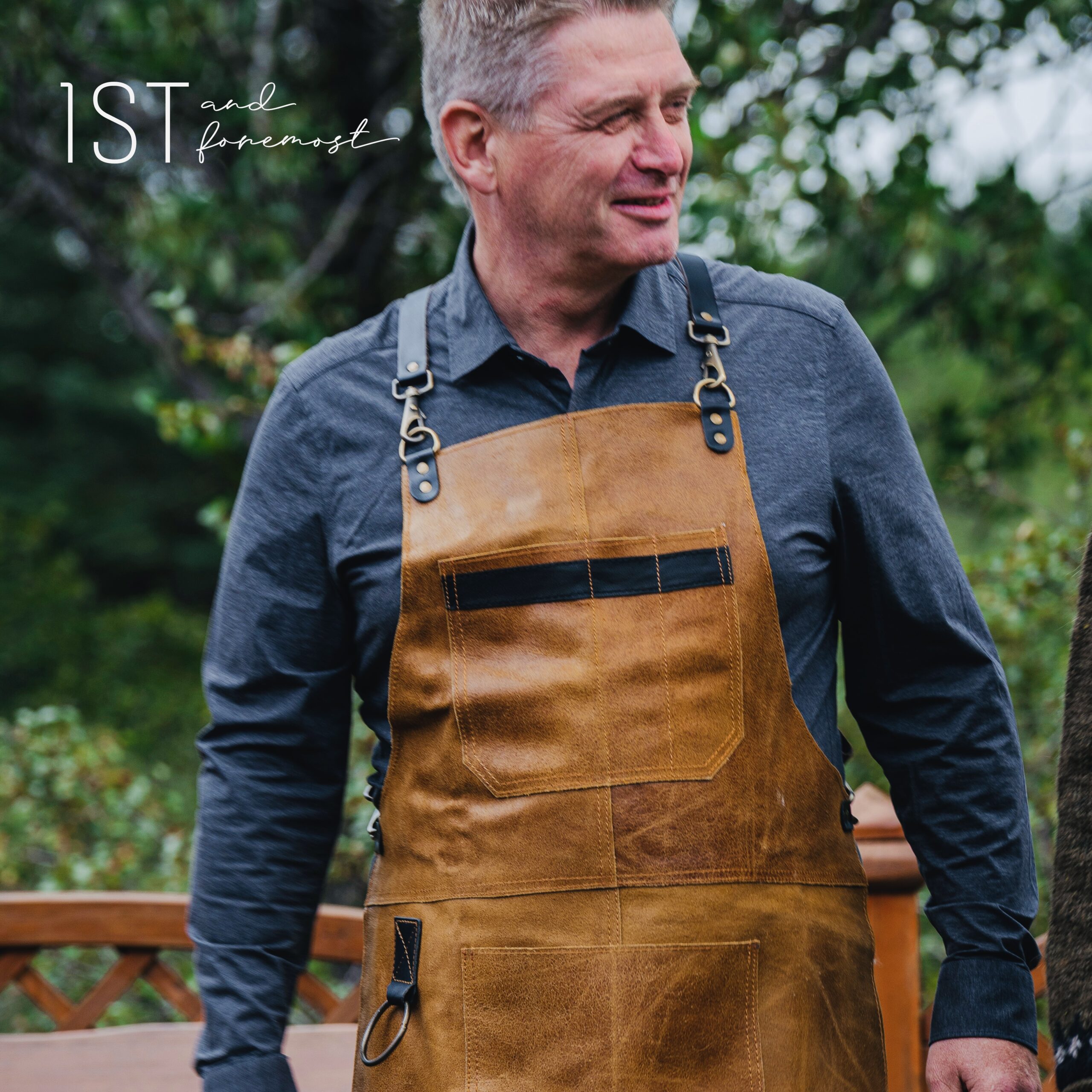 Leðursvuntan er handunnin og kemur með „cross-body“ ólum sem gera hana bæði flottari og þægilegri. Á svuntunni eru margskonar vasar og stálhringur fyrir viskastykkið. Hana má allt eins nota við vinnu í bílskúrnum, eldhúsinu og við grillið.