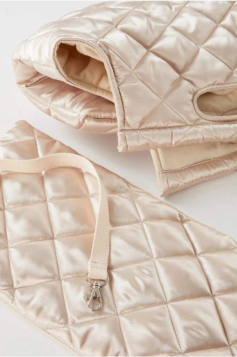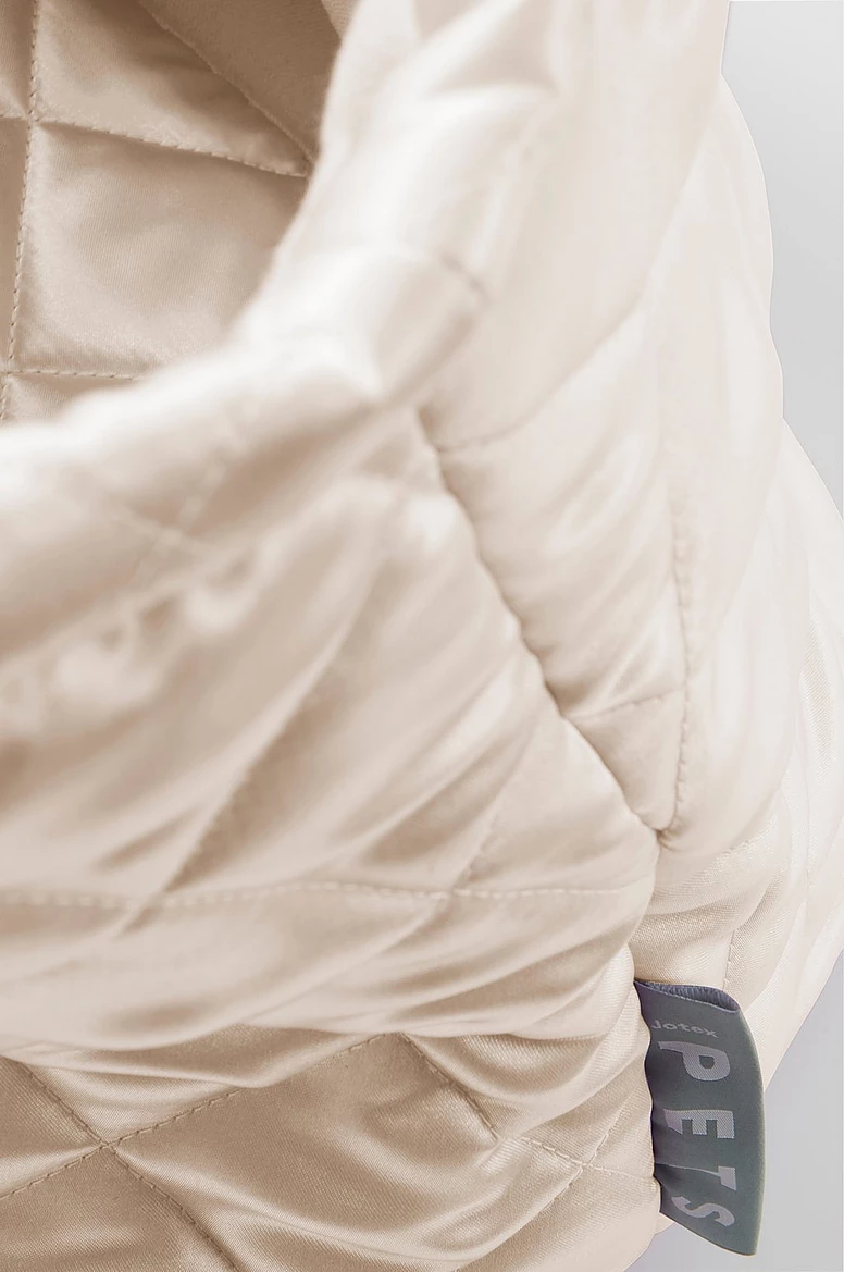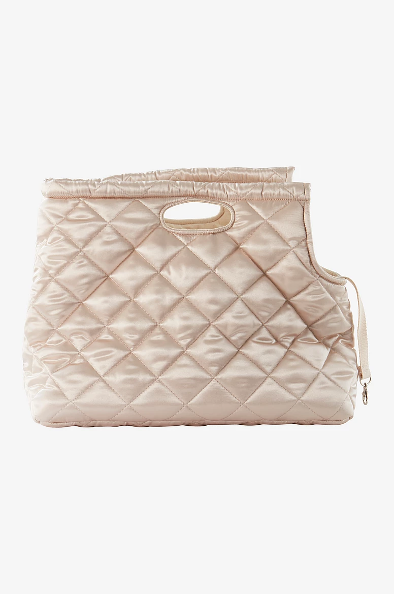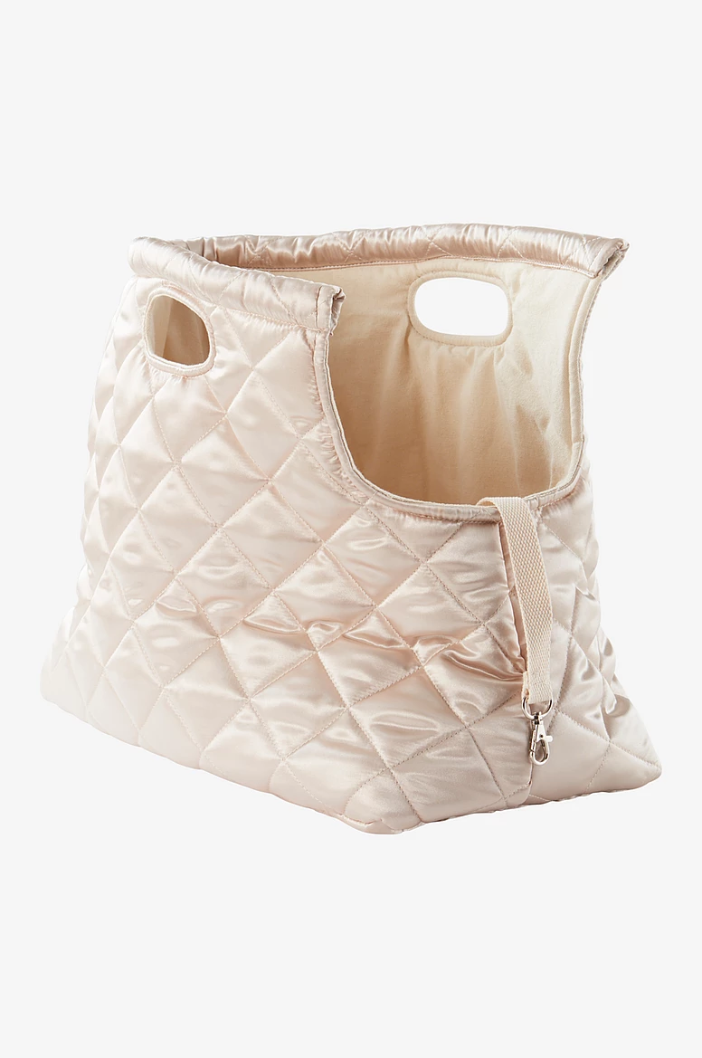 Stílhrein taska með saumuðum rúðum. Létt bólstrað ytra efni sem er þolið gegn rigningu og vindi. Ytra efnið er úr endurunnu pólýester og fóðrið er úr bómullarstriga. Botn töskunnar er stöðugur, þannig að dýrið getur legið, setið eða staðið í töskunni. Botnplatan er laus og klædd sama efni og taskan, þannig að hún er mjúk fyrir dýrið. Bólstruð brún í opnunninni. Ól úr efni með krók til að festa dýrið við beisli og ólin er fest við botninn. Þetta eykur öryggi. Auðvelt að bera með tveimur handföngum.