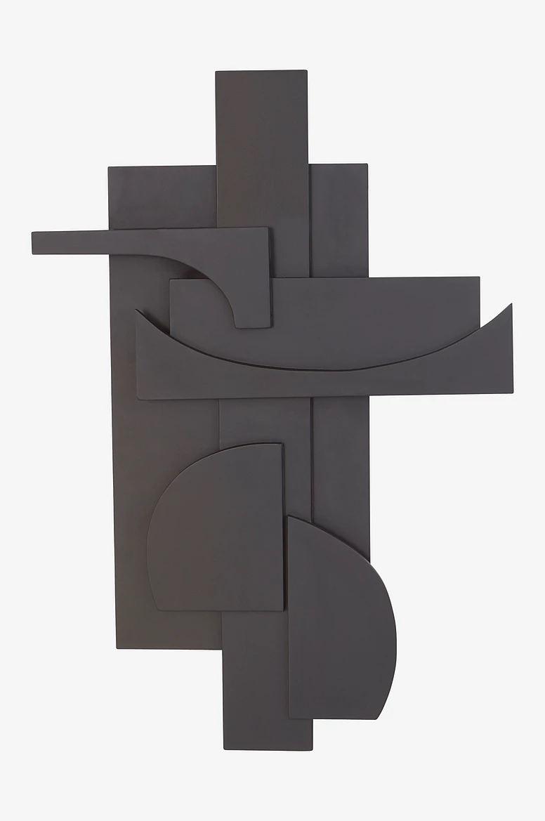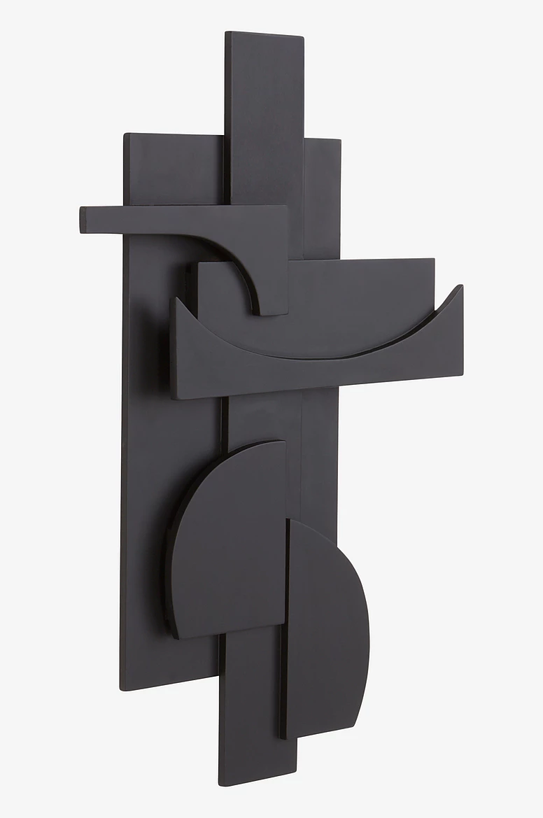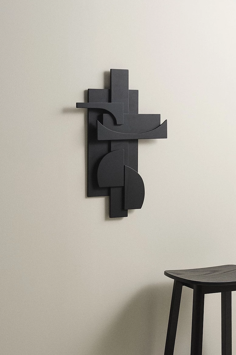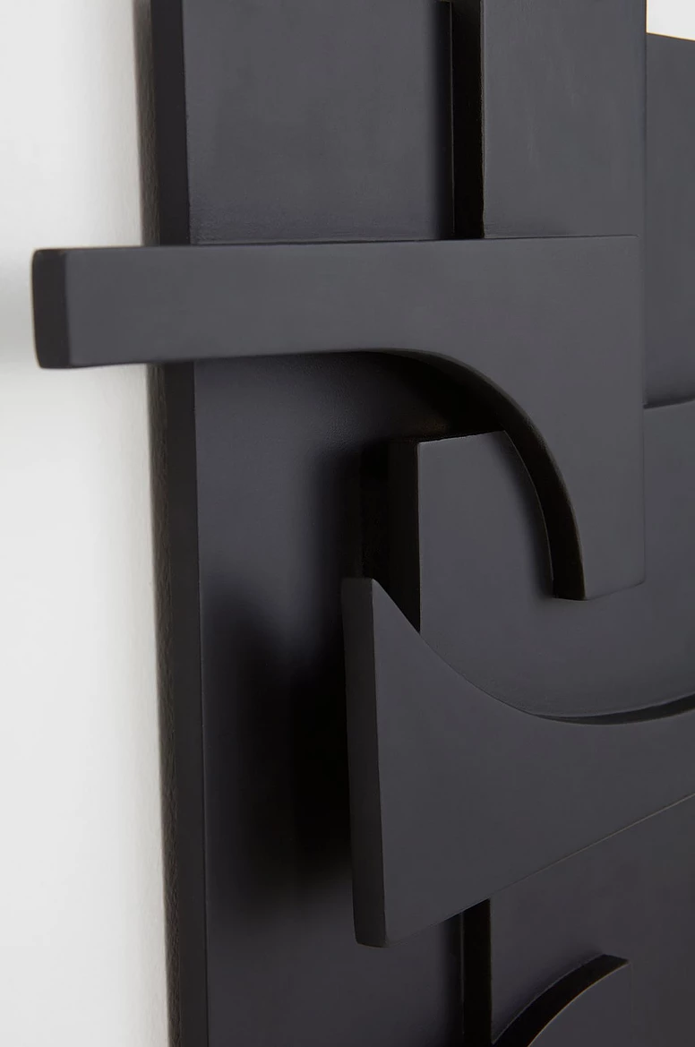 Veggskreytingin PIECES er úr tré og rúmfræðileg form á mismunandi stigum skapa skemmtilegan leik milli víddar og dýptar. PIECES er nokkuð stór að stærð og því mun skreytingin vekja athygli allra, hvar sem er. Flott er að para verkið við svarta ramma utan um málverkin í herberginu.