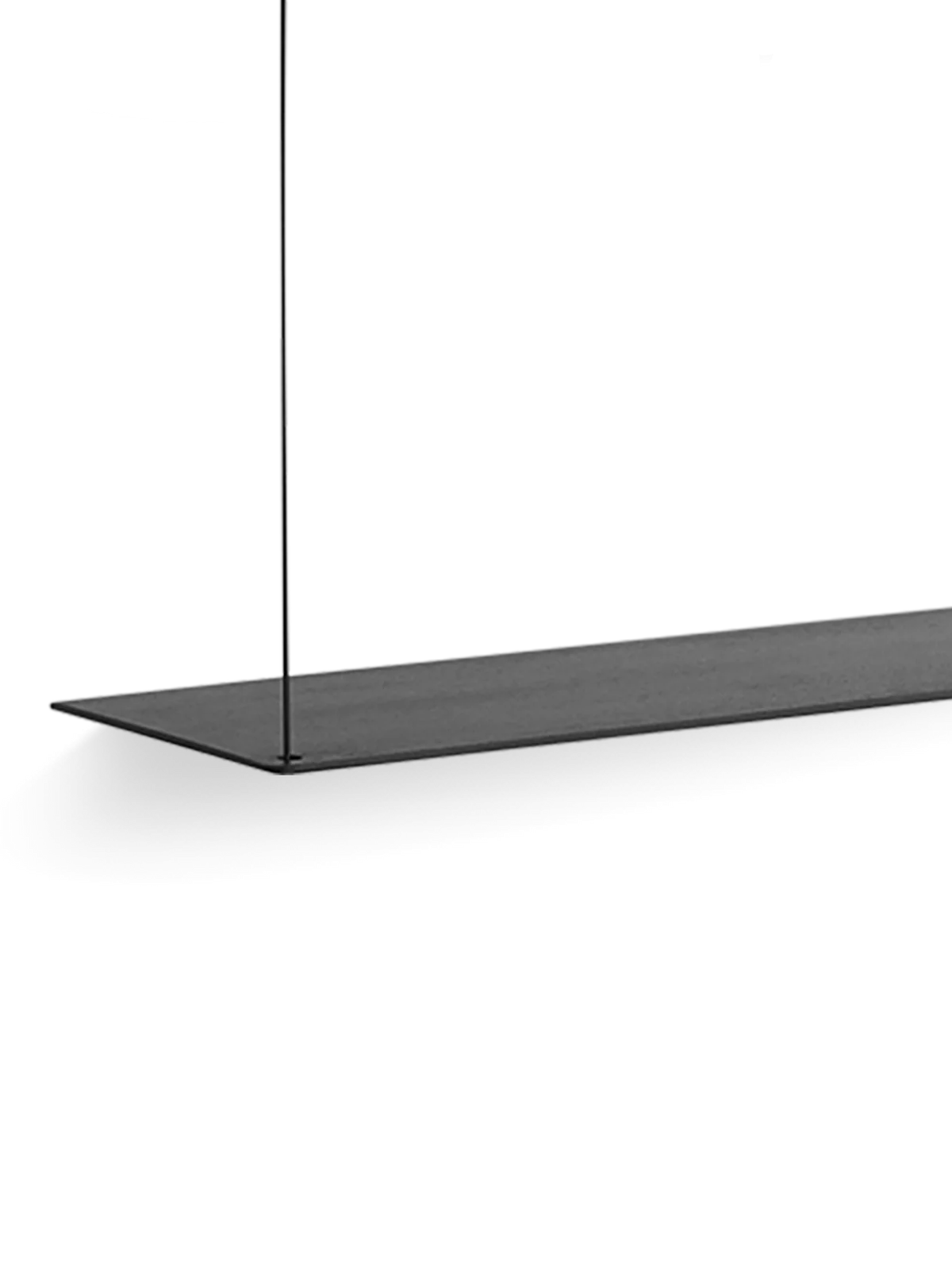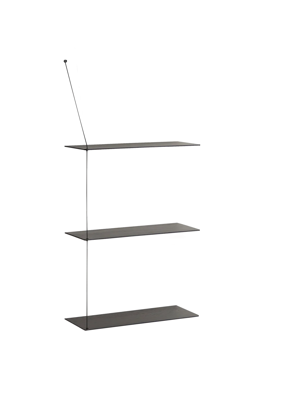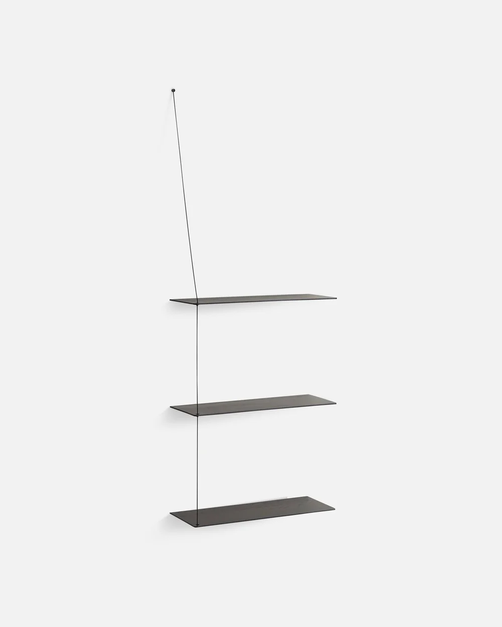 Fíngerða hönnunin er sjónblekking þar sem hillurnar virðast hanga á einum þræði.